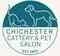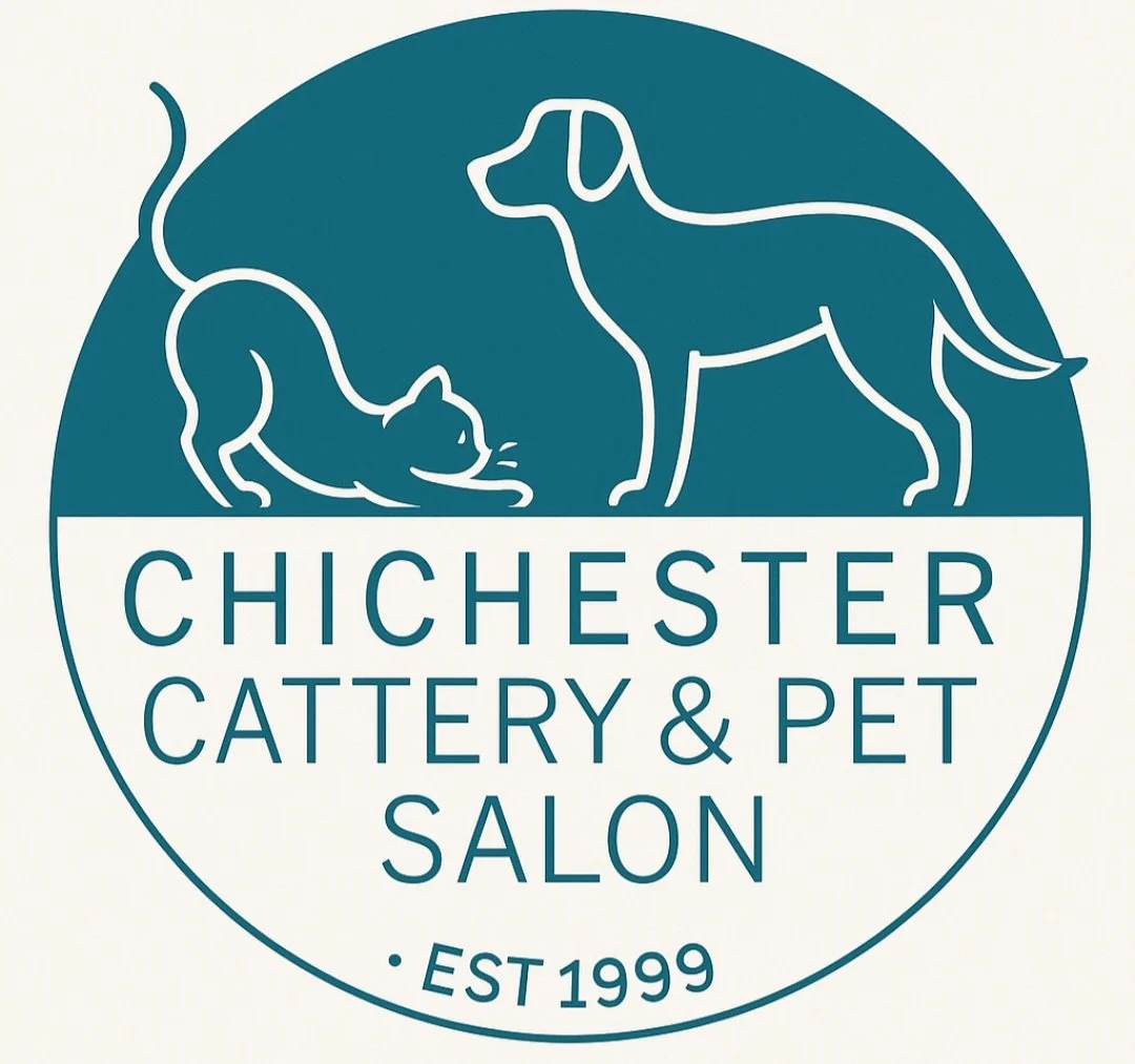 Logo for Chichester Cattery & Pet Salon with a dog and cat illustration, set against a background of bluebells and trees.